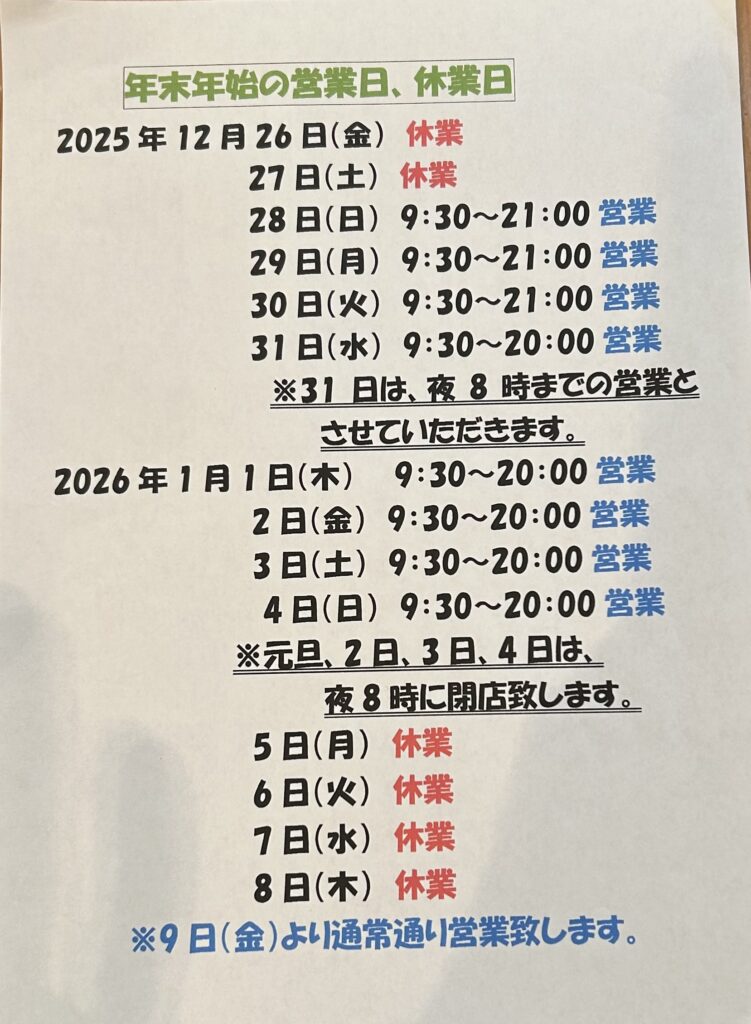 年末年始の営業日、休業日